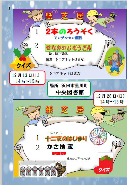| 目的 | 「シニアネットはまだ」の理念であるICT(情報通信技術)を駆使して豊かな高齢化社会の実現に向けての手助けとして「電子紙芝居」を部員一同で作成し、高齢者の各団体から日本の未来を担う園児たちの前で積極的に演じていきます。 |