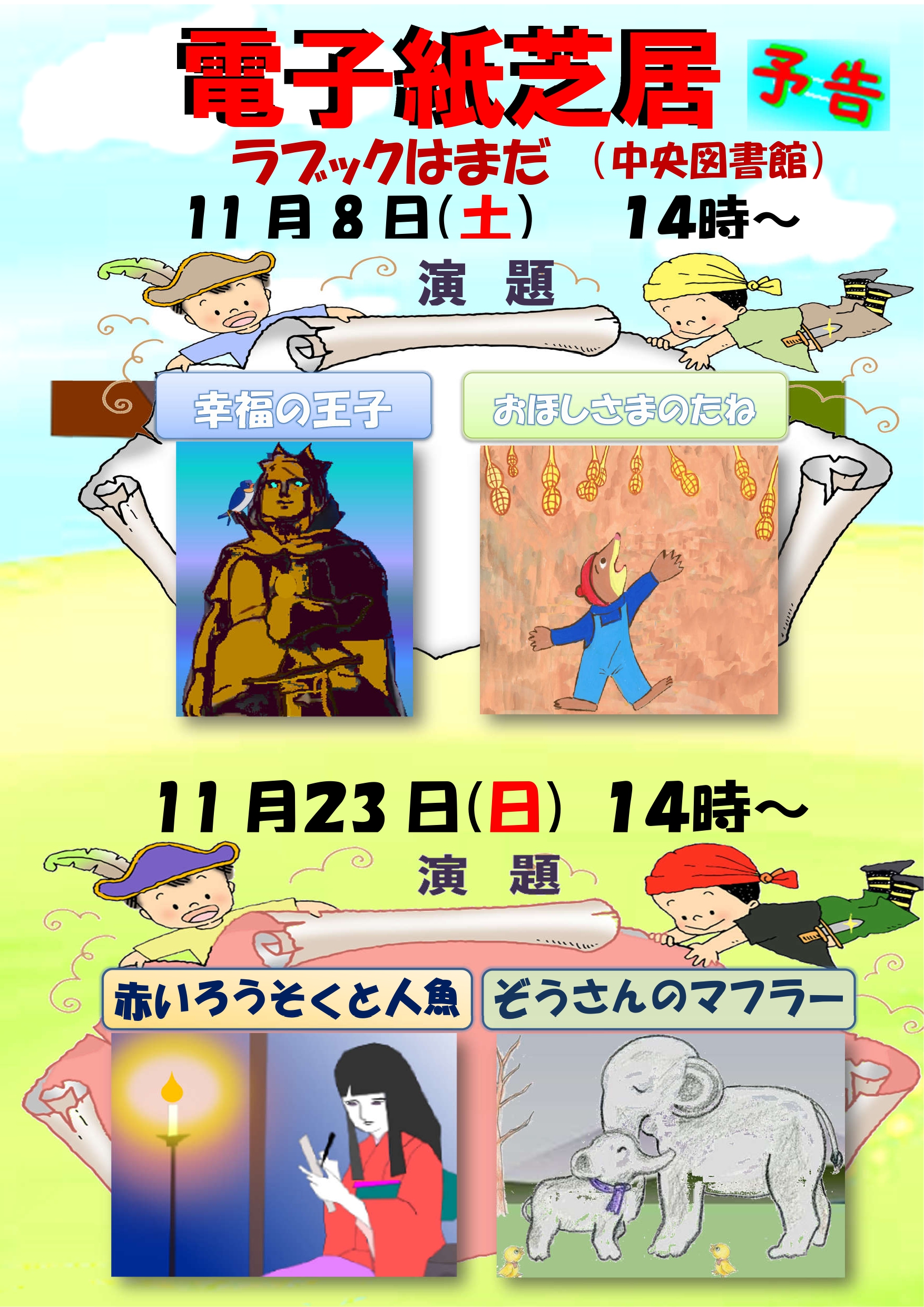 | 目的 | 「シニアネットはまだ」の理念であるICT(情報通信技術)を駆使して豊かな高齢化社会の実現に向けての手助けとして「電子紙芝居」を部員一同で作成し、高齢者の各団体から日本の未来を担う園児たちの前で積極的に演じていきます。 |